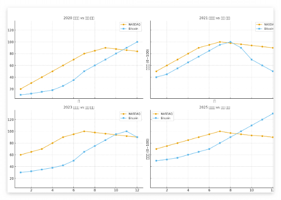 위의 표는 2020년~25년까지의 나스닥과 비트코인의 흐름을 한 번 돌아보고자 준비했다.